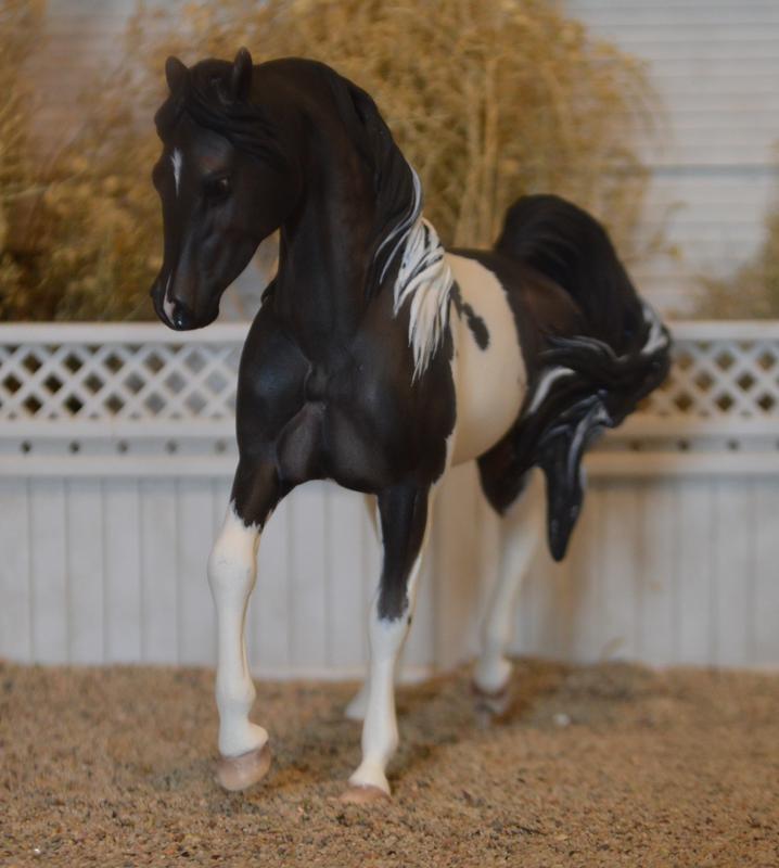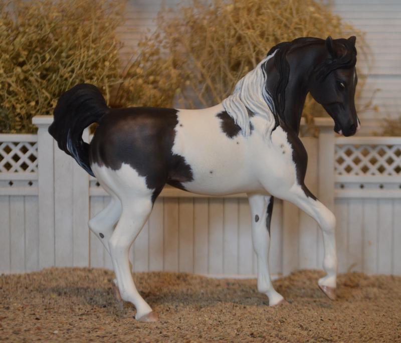 Now a stunning half Arabian Pinto mare. Redone head and neck, with new ears, and a custom mane and swishy tail. All her legs have been modified, and she now has a clear peg under her hind foot. Mulberry undertones on this dapple black paintjob. Super pretty!