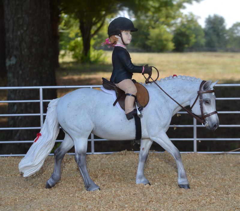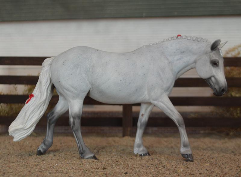 Now a fancy Welsh Hunt Pony! Modified head and neck, mane removed and replaced with big fat pony braids. New tail with an extra little plait-red bow in the tail, and a red cheater braid in the mane. Painted a mega-flea bit grey, she’d look great with a kid rider…this one is available (please inquire)