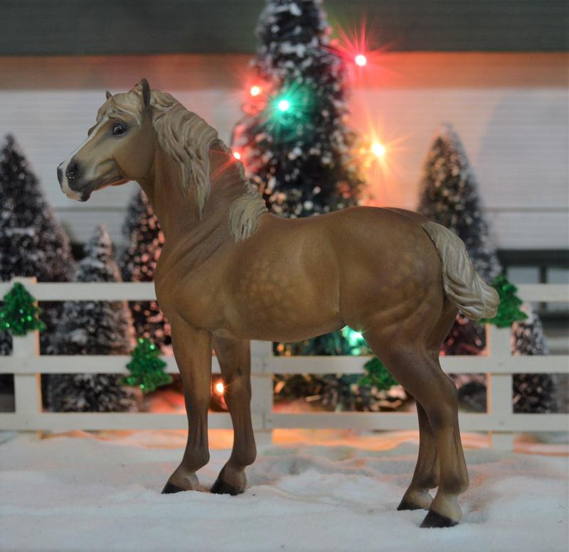 This is one of my sculpts, limited to a run of 25. This one has been heavily customized, with a re-done head and neck, beefier barrel and topline, and a custom thick mane and swishy tail. A true one of a kind. He has been painted as a Belgian, soft and creamy chestnut colour. $475.00