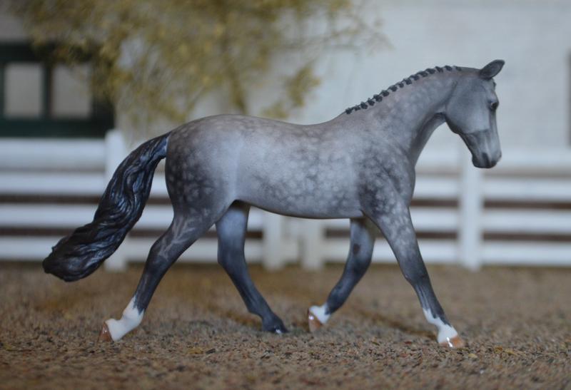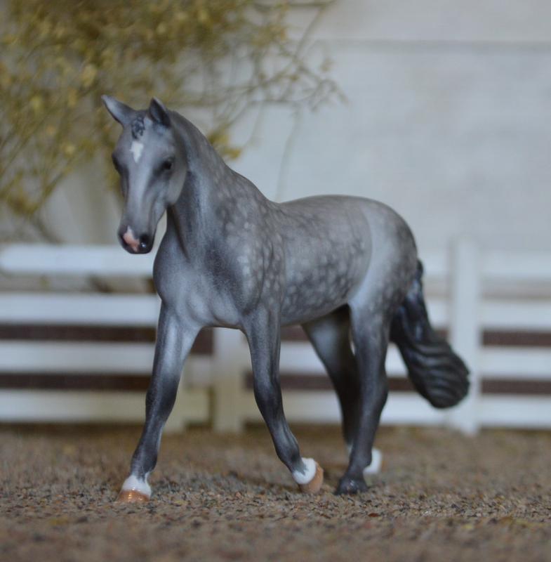 From the trotting mold…really cute with some work! A lovely little performance mare. She has had her head resculpted, with new ears, plus a hunter braided mane. All her legs have been modified and detailed, and she has been painted a medium dapple grey. $400.00