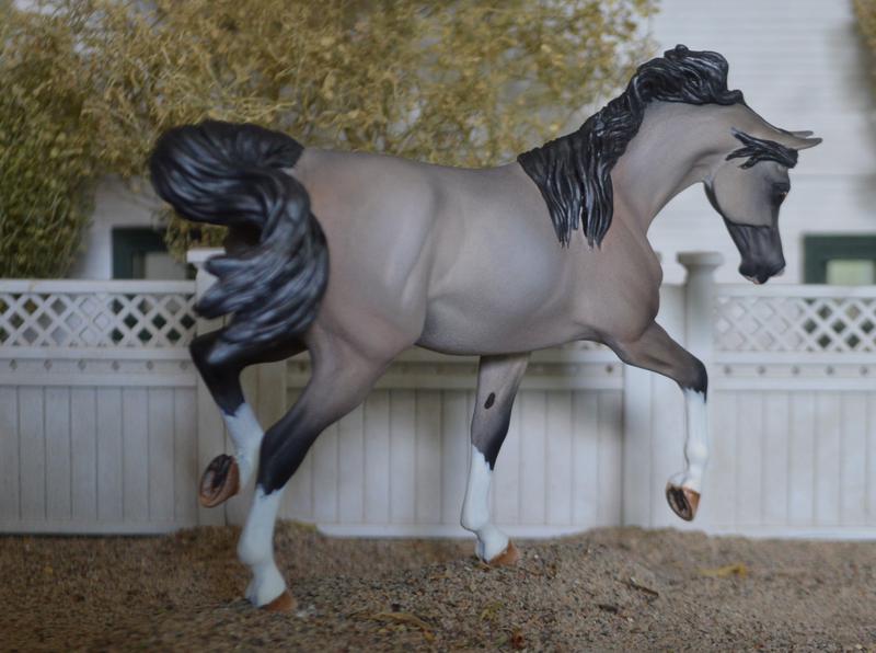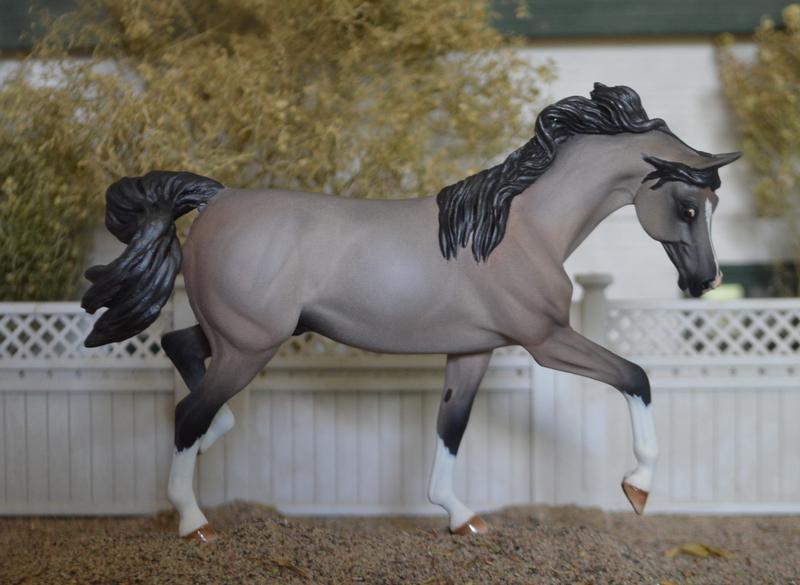 Pluto~Custom Resin Pebbles scale Arabian Stallion~sculpted by D’Arry Jone Frank. This is a companion to my Venus, a high stepping park trot fellow. He has a custom performance friendly mane, and a custom swishy tail. He is painted a solid rose grey, with chrome, and is removable from his base. Only a couple left in my storage boxes of this guy left to do. $525.00